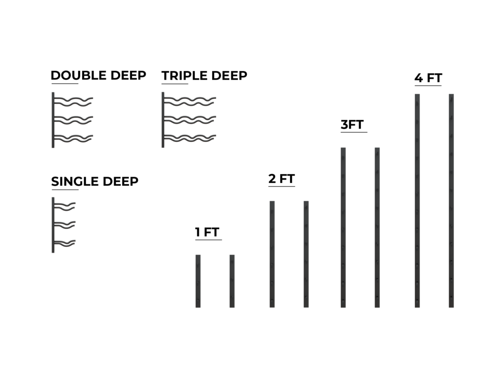 E-Series wall rails are available in four rail heights (1 ft, 2 ft, 3 ft, and 4 ft) and three bottle depth options (single, double, and triple). Rails can be stacked vertically to create larger wine walls while increasing storage capacity. Our wall rails can hold 3-36 bottles on each metal wall wine rack.